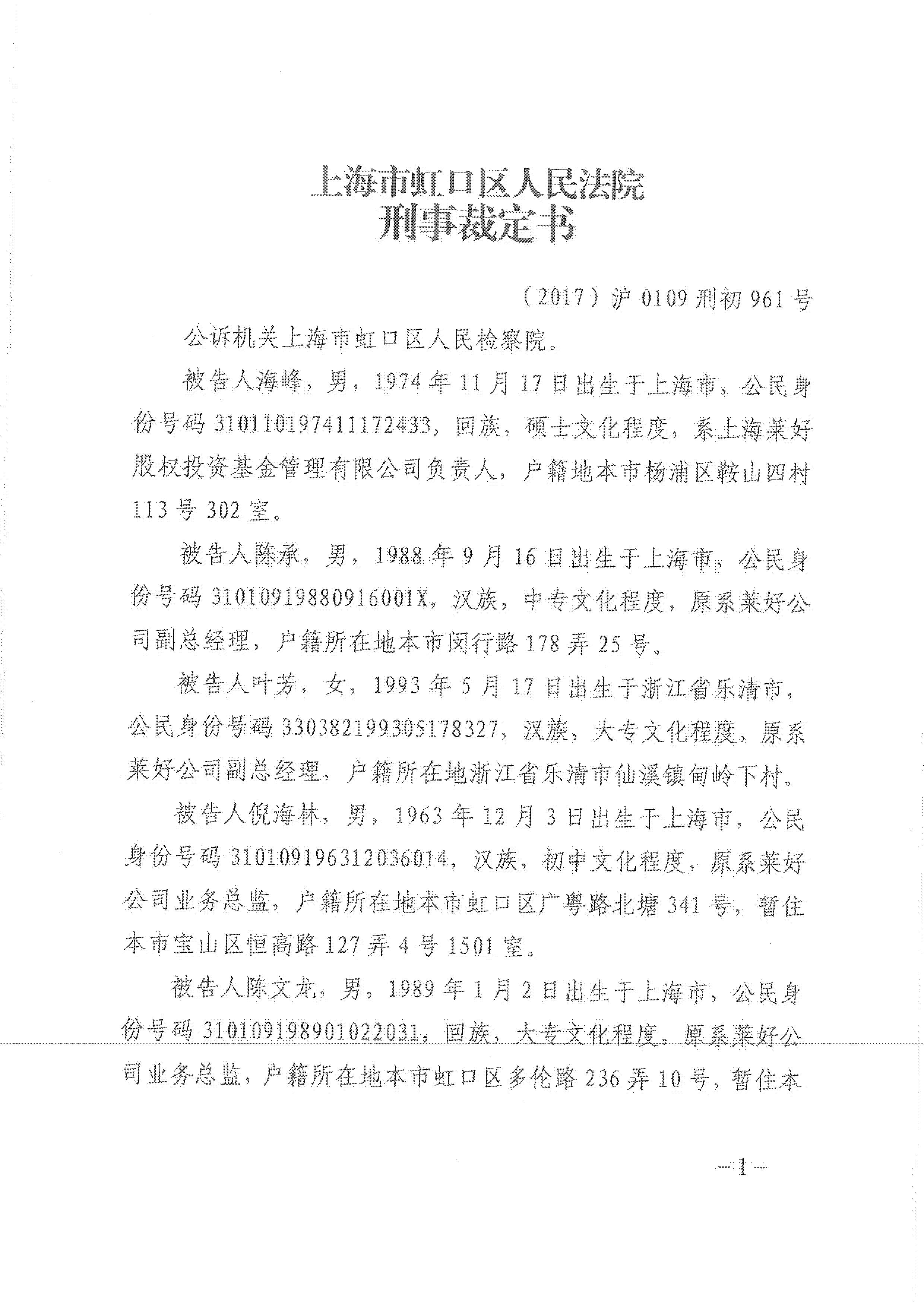 上海市虹口区人民法院刑事裁定书(2017)沪0109刑初961号