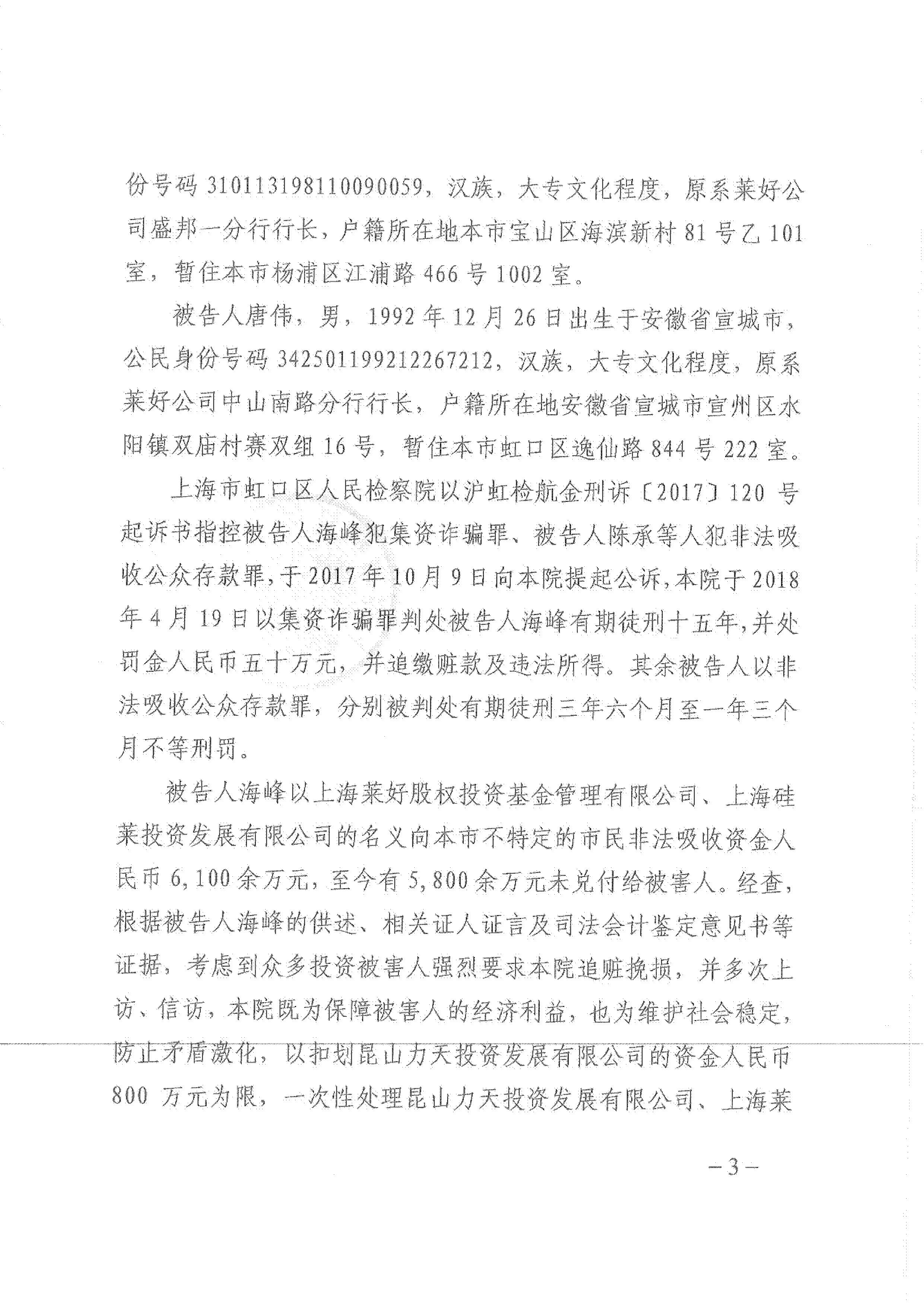 上海市虹口区人民法院《一次性扣划上海莱好股权投资基金管理有限公司在昆山力天投资发展有限公司的资金800万元》的刑事裁定书