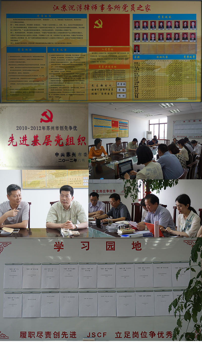 江苏沉浮律师事务所现有执业律师45人,其中党员律师16人,2003年成立党支部。近年来,在上级党委的正确领导下,坚持以十八大精神为指引,高扬党旗不动摇、致力为公不懈怠、服务群众不停步,全力打造先锋律所党支部,先后获评苏州市新社会组织党建工作示范点、全省司法行政系统创先争优活动先进集体等荣誉称号、苏州市创先争优先进基层党组织。我们的主要做法是: