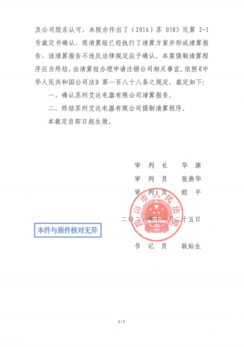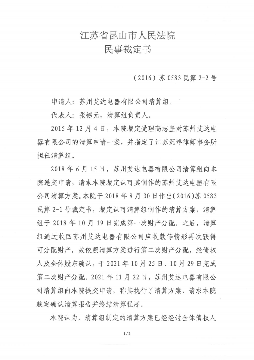 苏州艾达电器有限公司终结强制清算程序民事裁定书公示