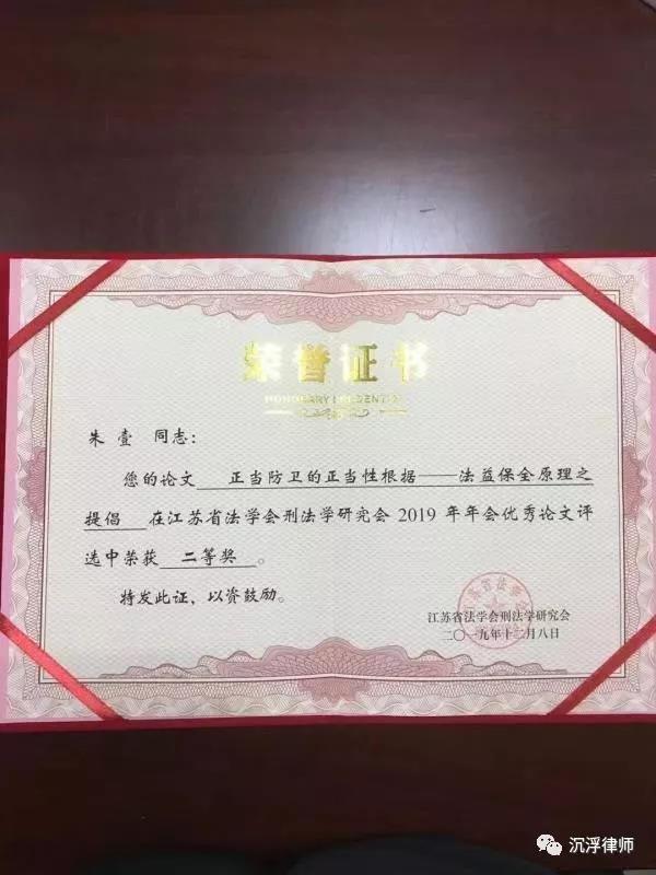 首先,2019年12月8日,我所朱壹律师的论文《正当防卫的正当性根据——法益保全原理之提倡》在江苏省法学会刑法学研究会2019年年会优秀论文评选中荣获二等奖。