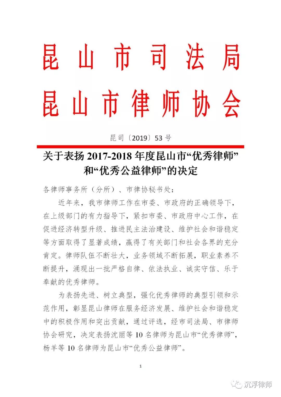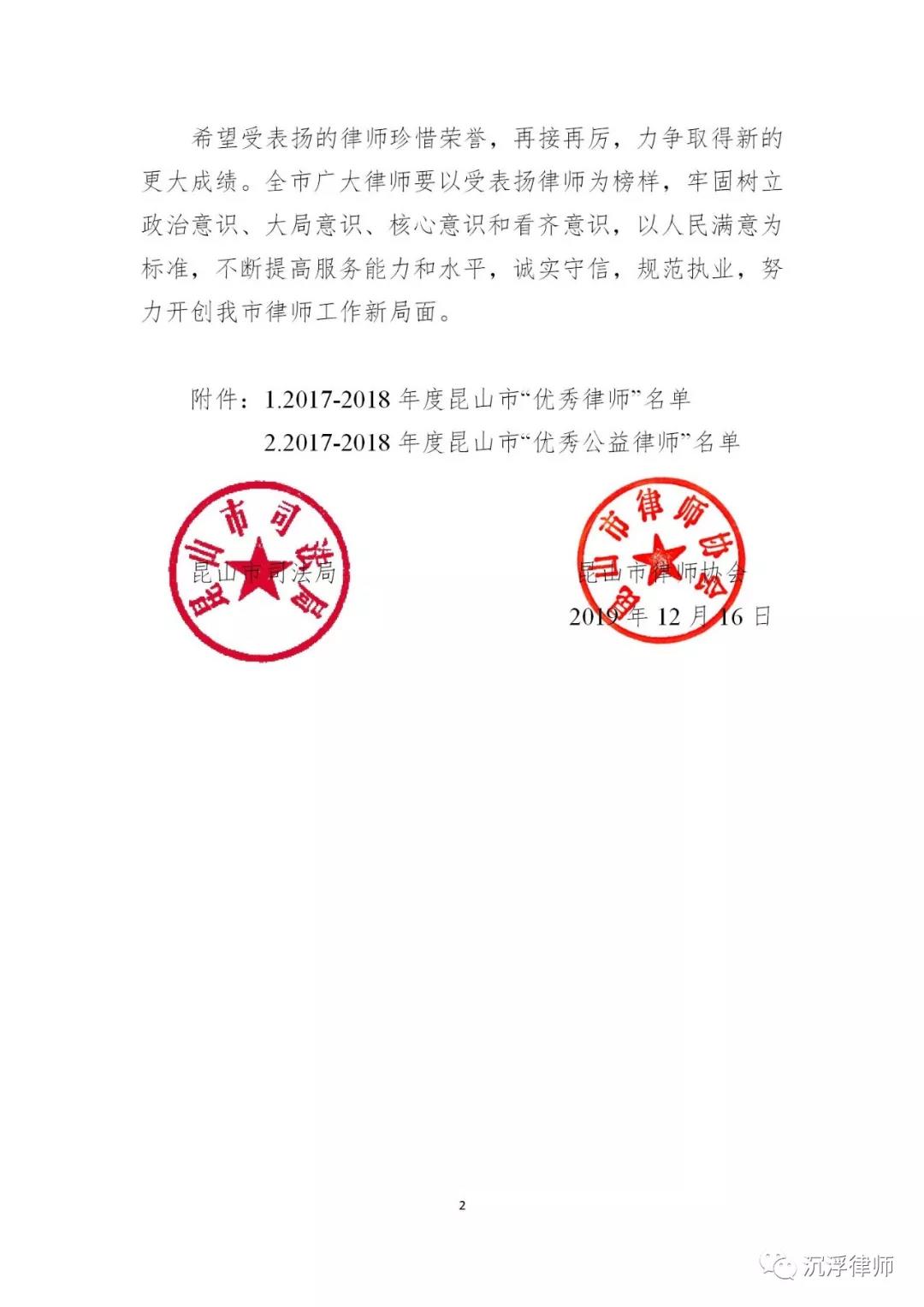之后,我所再传喜讯。2019年12月16日,通过评选,经昆山市司法局、律师协会研究,决定表扬我所王蓉晖、沈丽律师为2017-2018年度优秀律师,表扬我所杨羊律师为昆山市优秀公益律师!