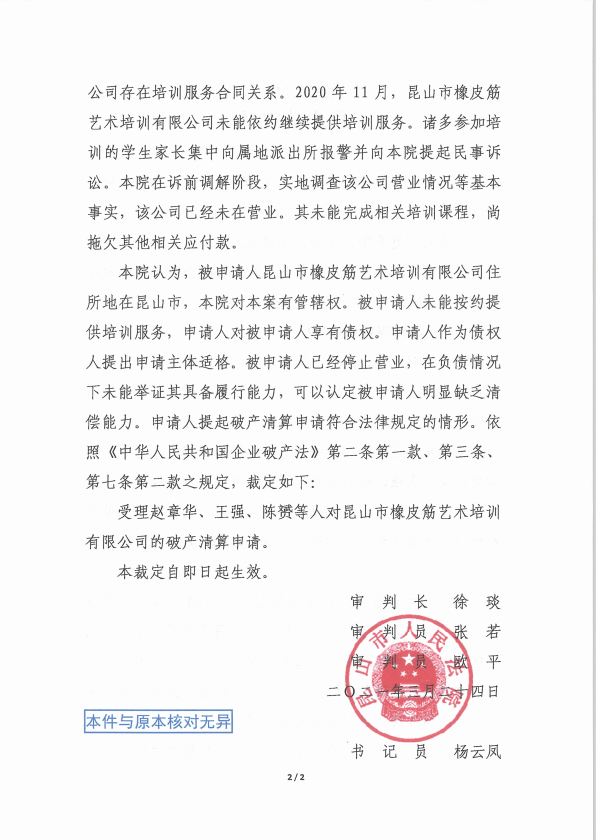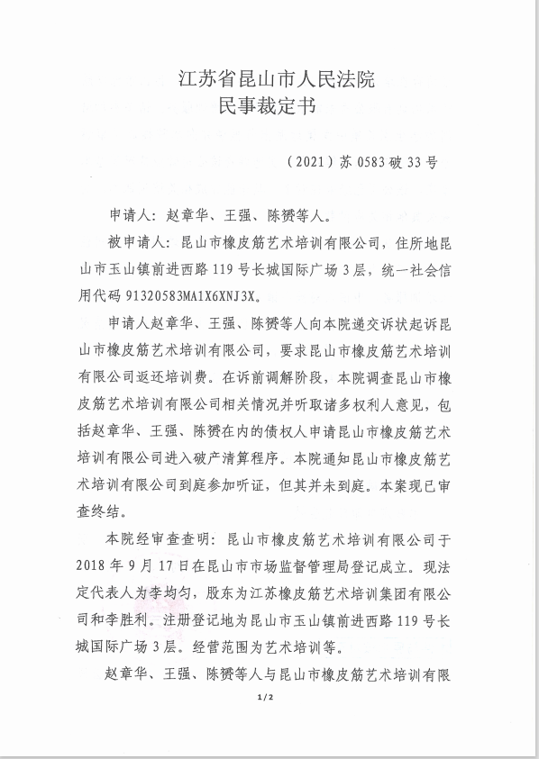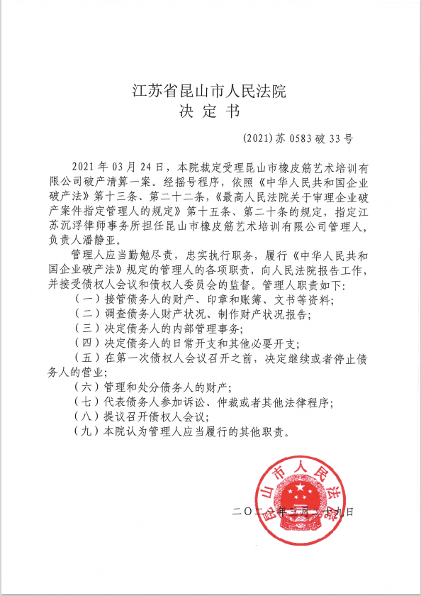 昆山市人民法院根据赵章华、王强、陈赟等人的申请,于2021年3月24日作出了(2021)苏0583破33号《民事裁定书》,裁定受理了昆山市橡皮筋艺术培训有限公司(以下简称“橡皮筋公司”)破产清算一案,并于2021年3月29日指定江苏沉浮律师事务所为橡皮筋公司管理人。