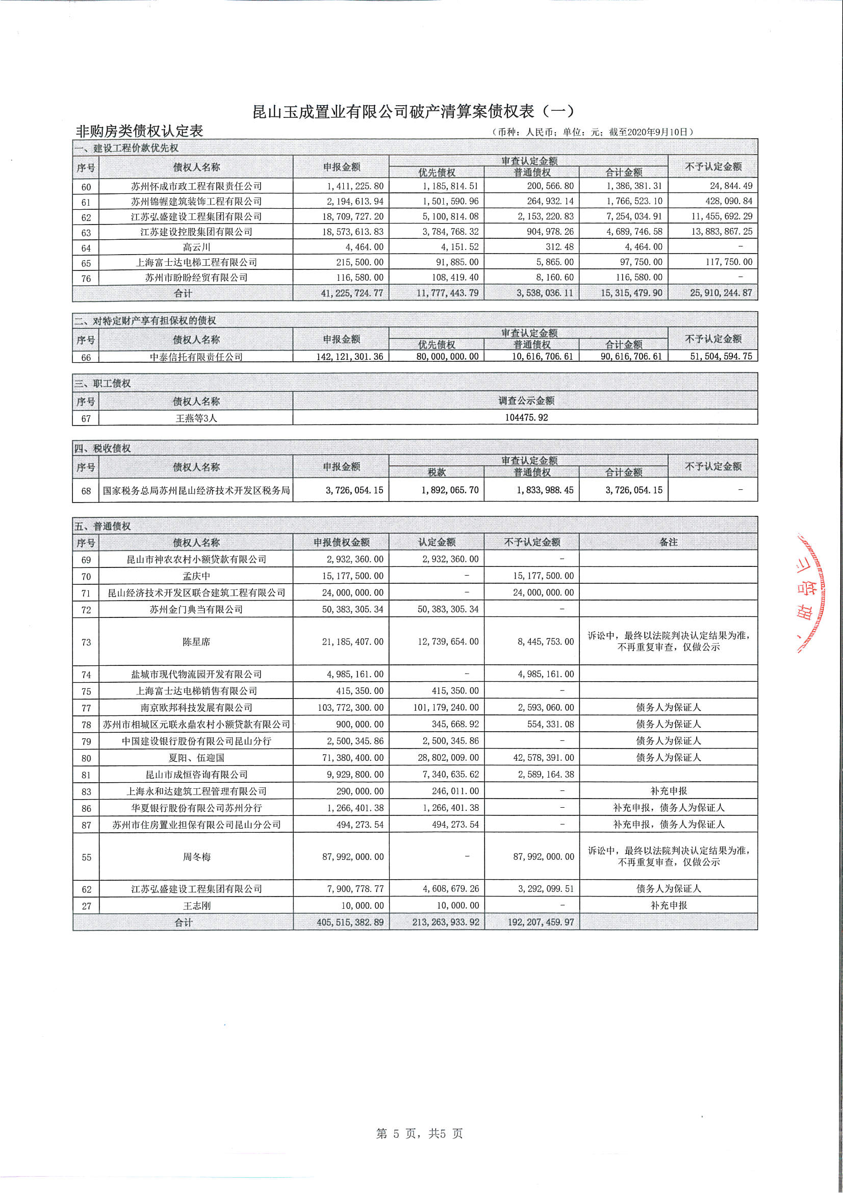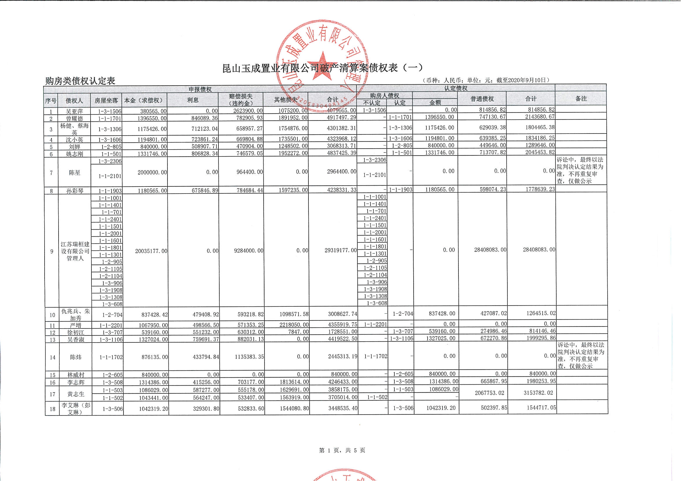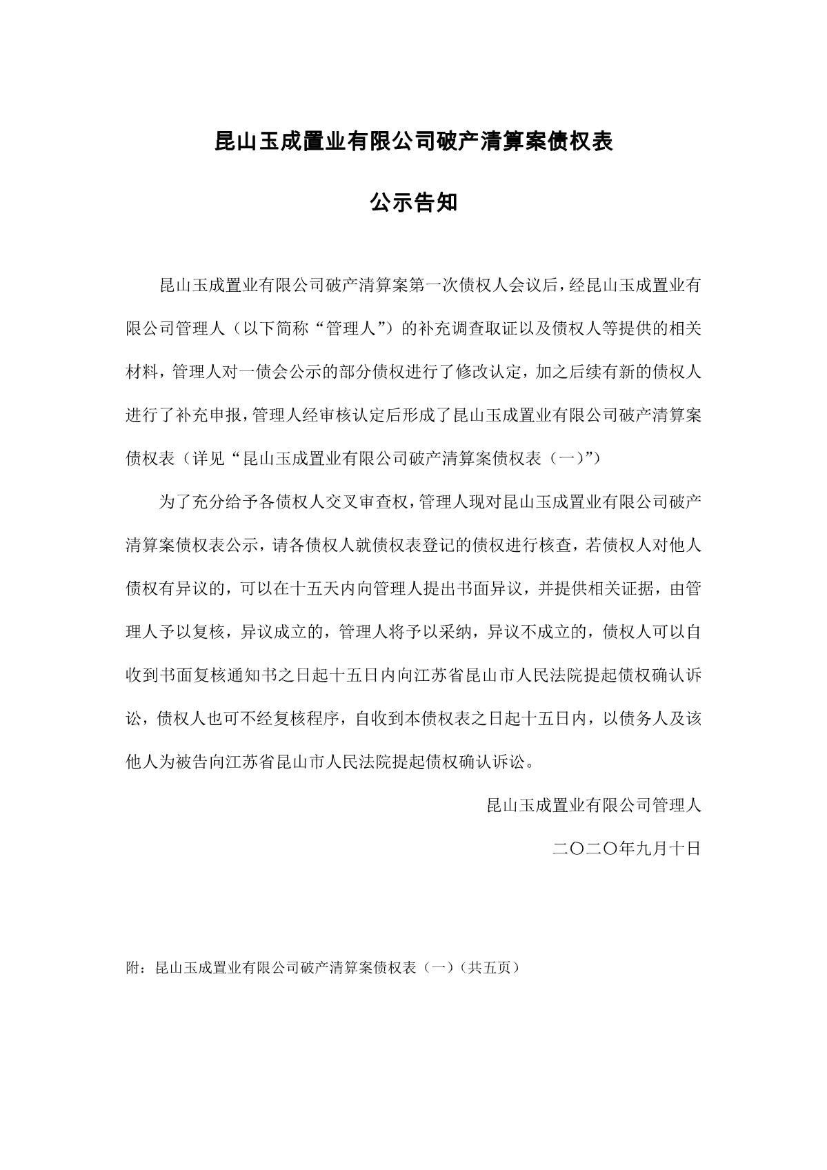 昆山玉成置业有限公司破产清算案债权表(一)公示