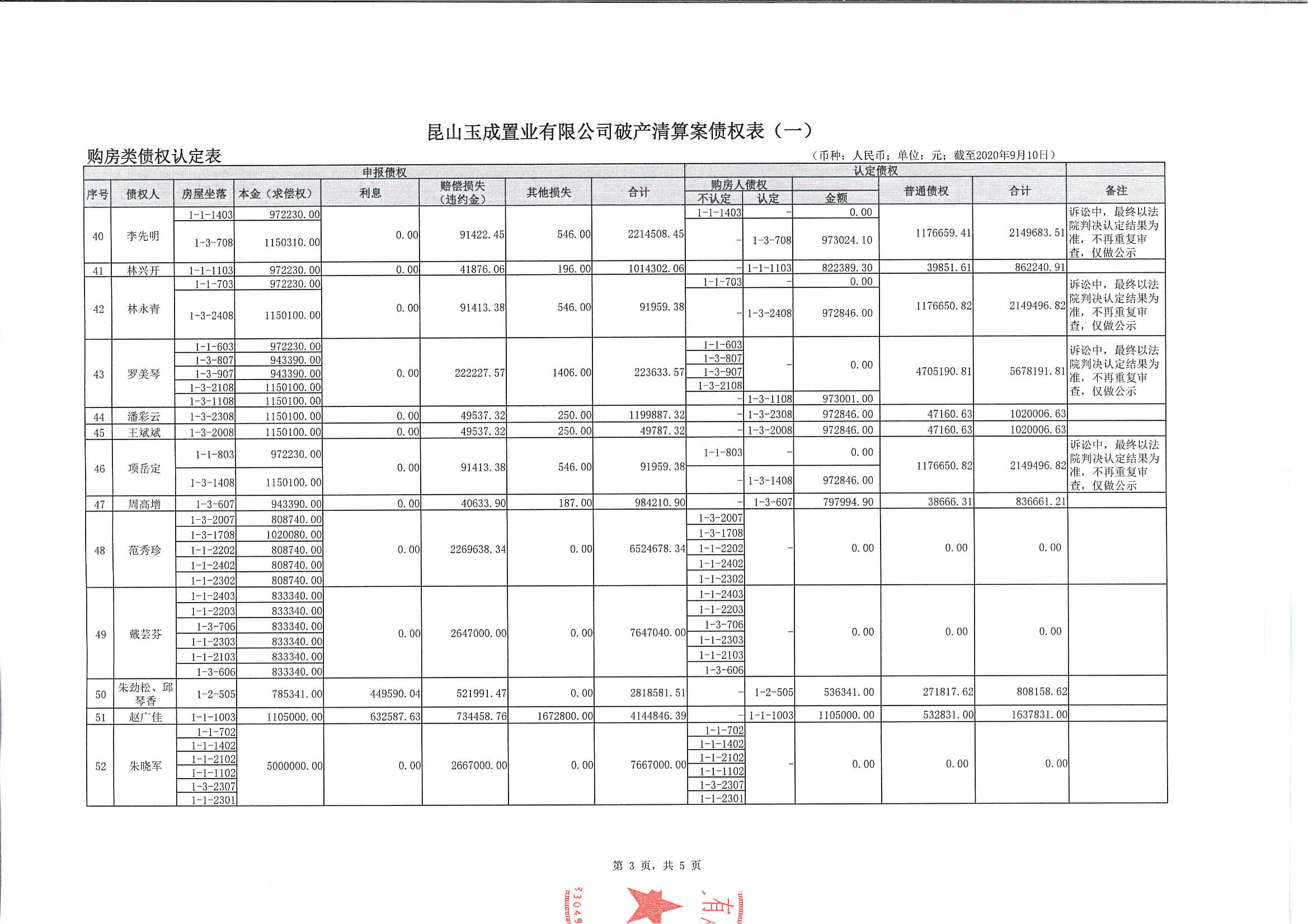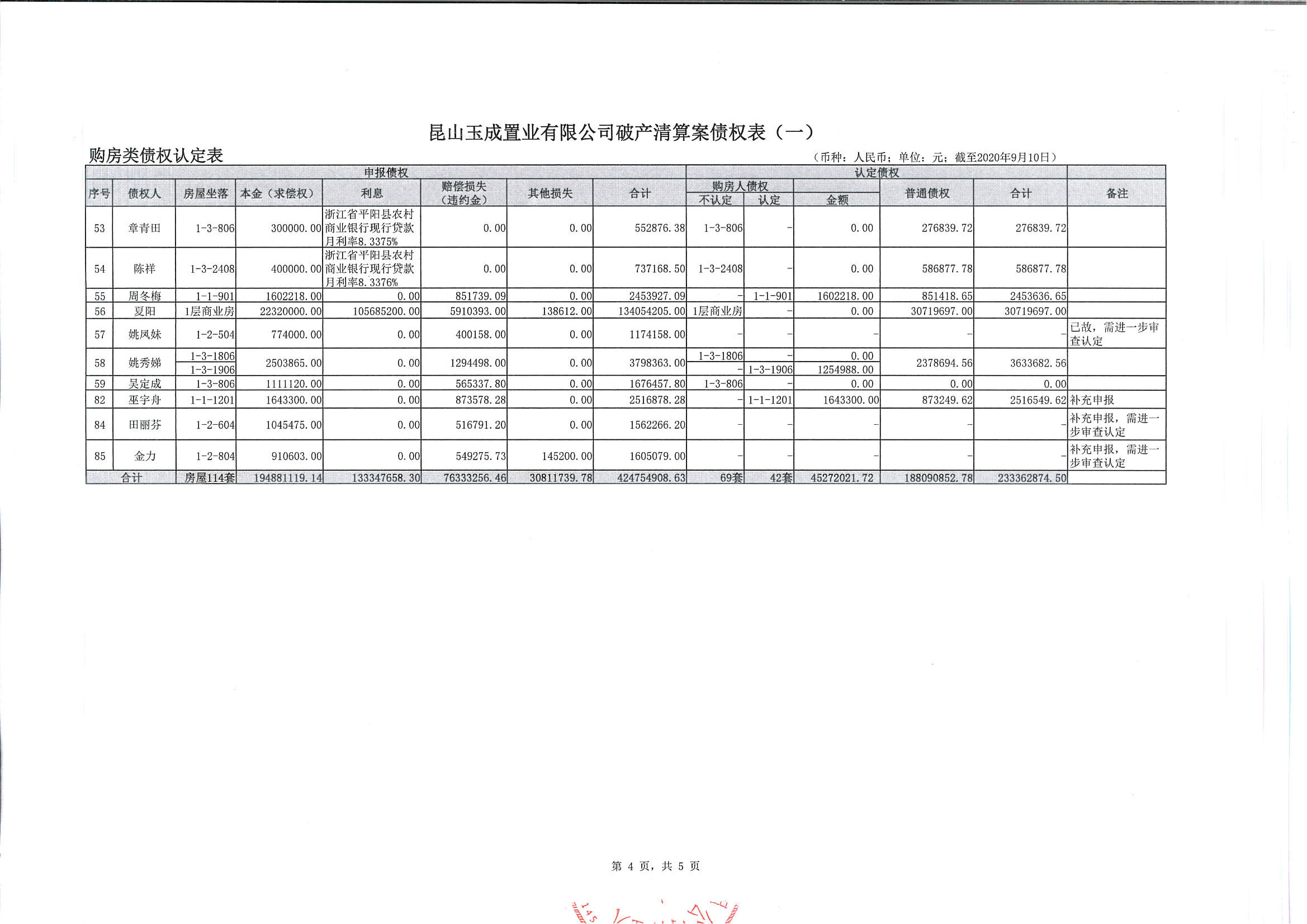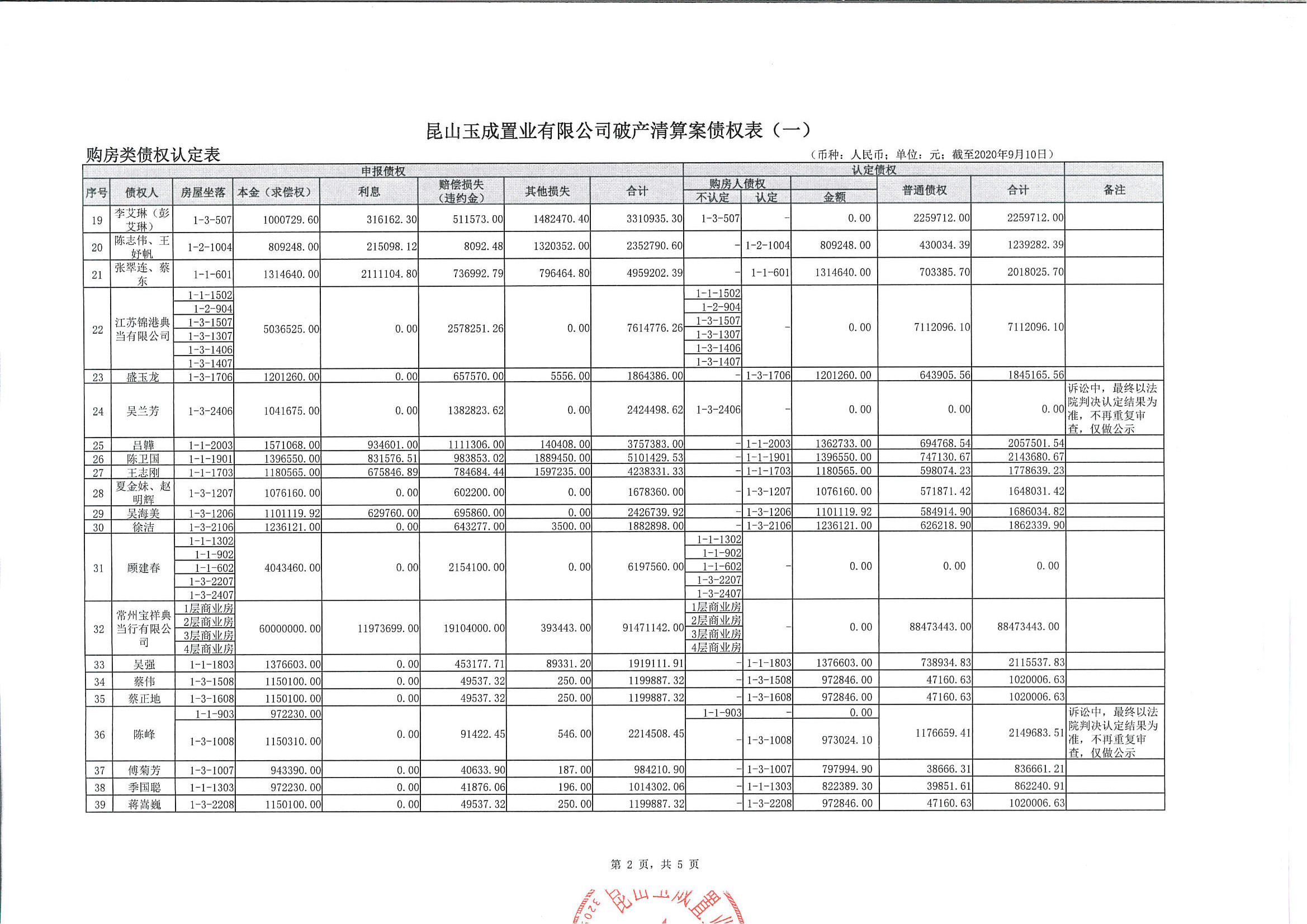 昆山玉成置业有限公司破产清算案债权表(一)公示