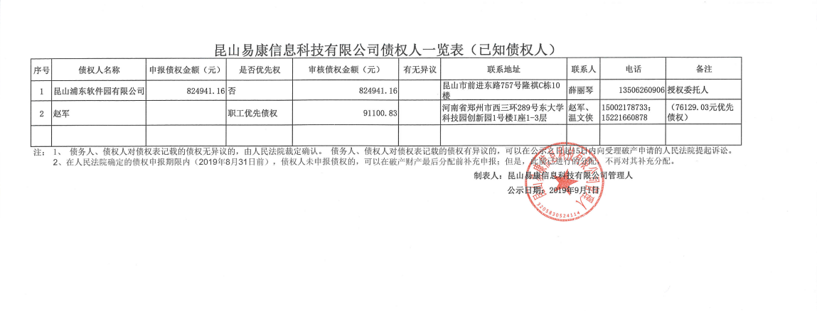 昆山易康信息科技有限公司债权人一览表(截止2019年9月1日)