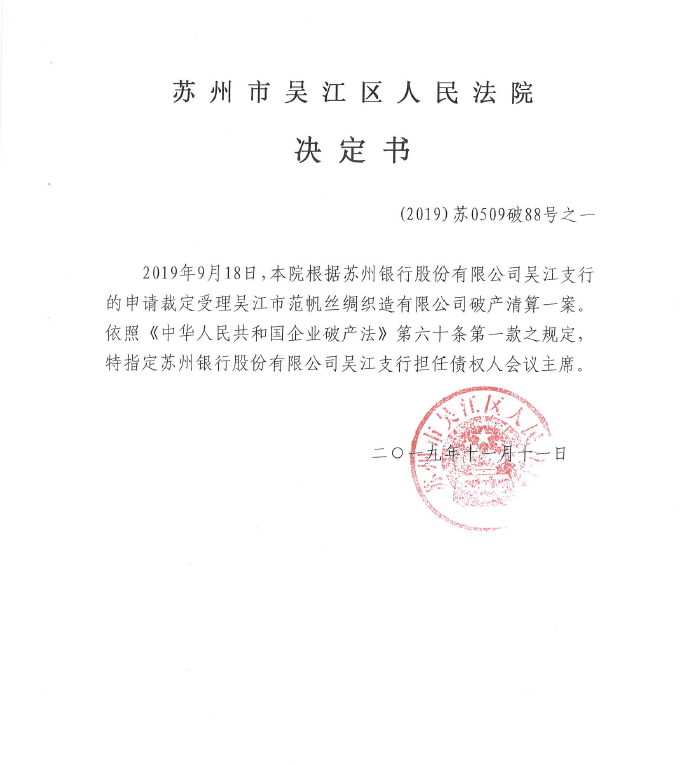 2019年11月11日,吴江市范帆丝绸织造有限公司第一次债权人大会,吴江区人民法院作出苏州银行吴江支行担任债权人会议主席的决定
