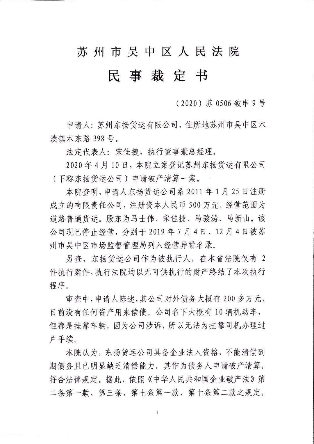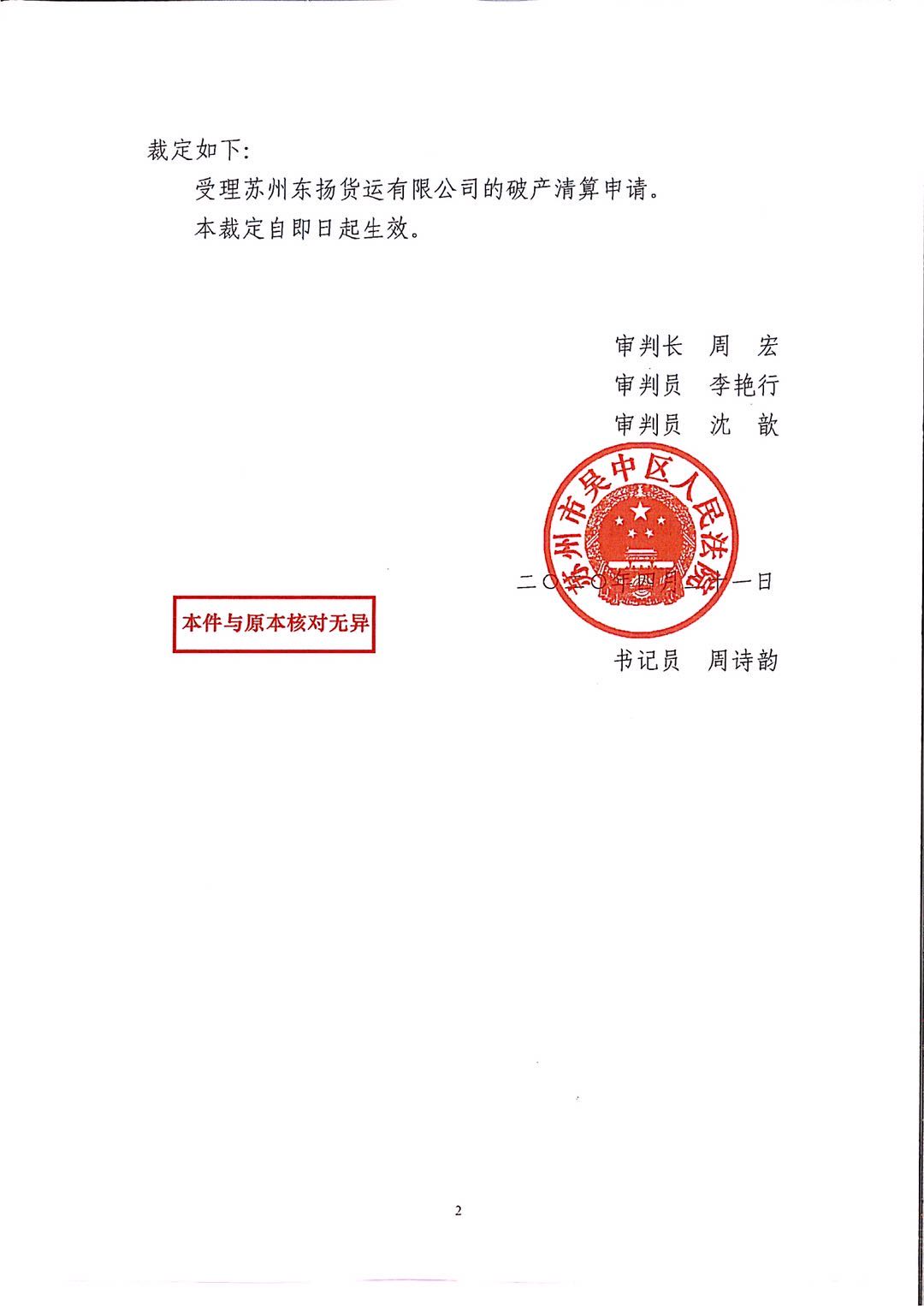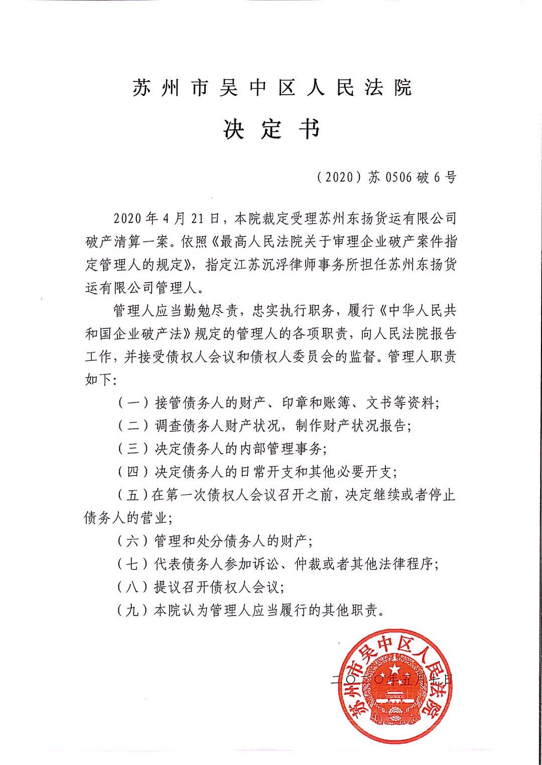 江苏沉浮律师事务所担任苏州东扬货运有限公司破产管理人