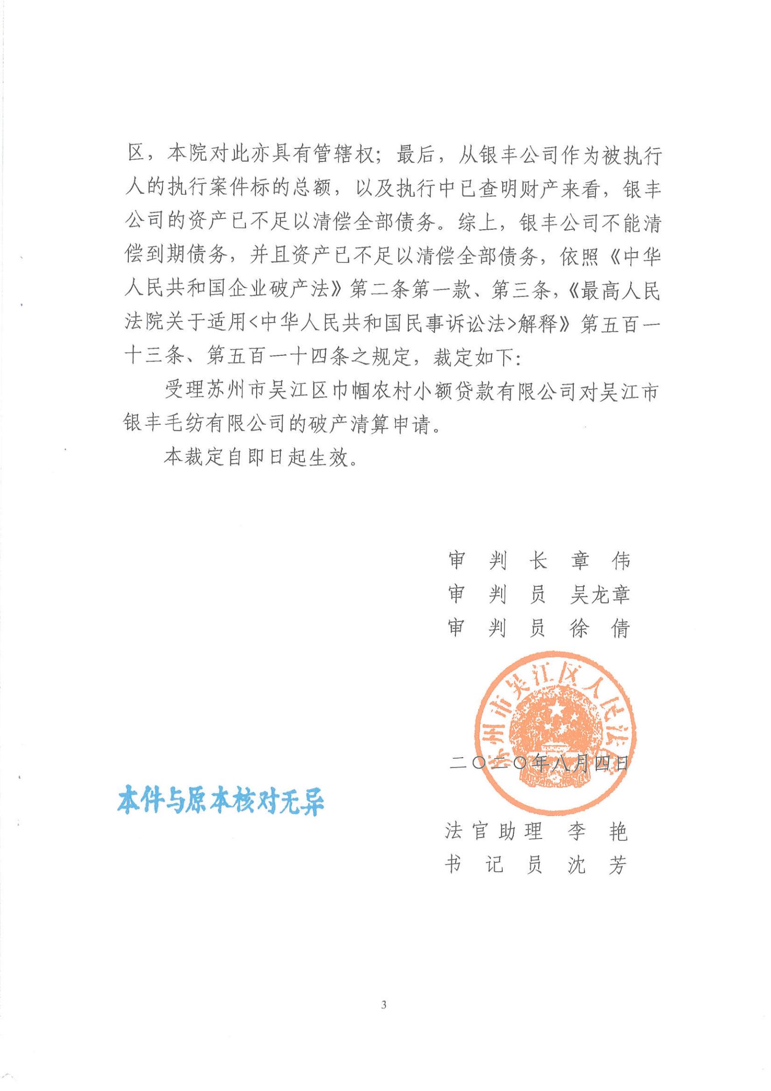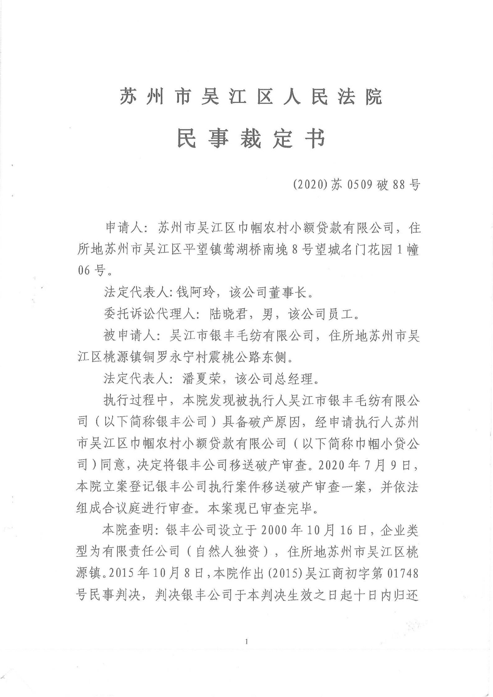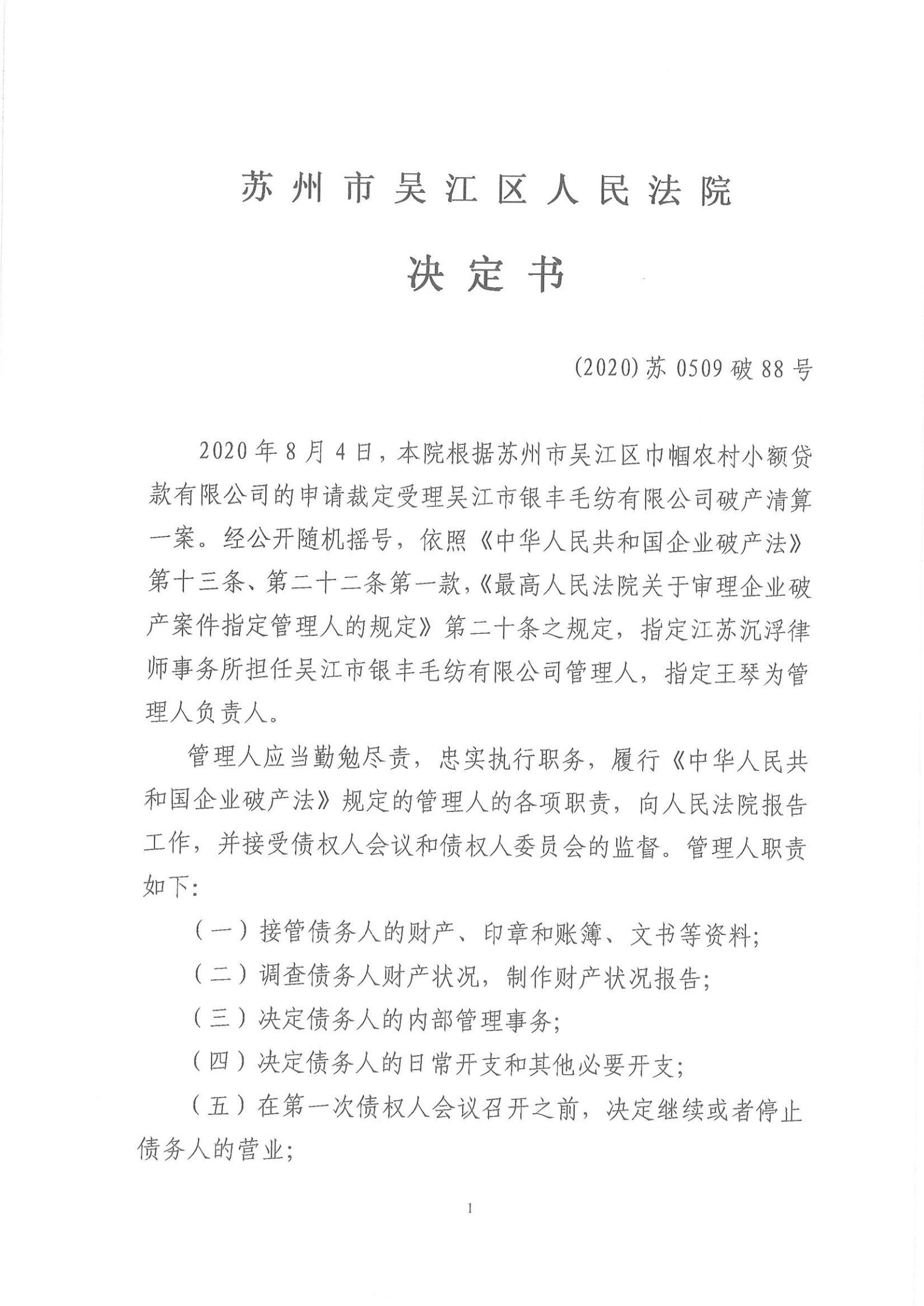 江苏沉浮律师事务所担任吴江市银丰毛纺有限公司破产管理人