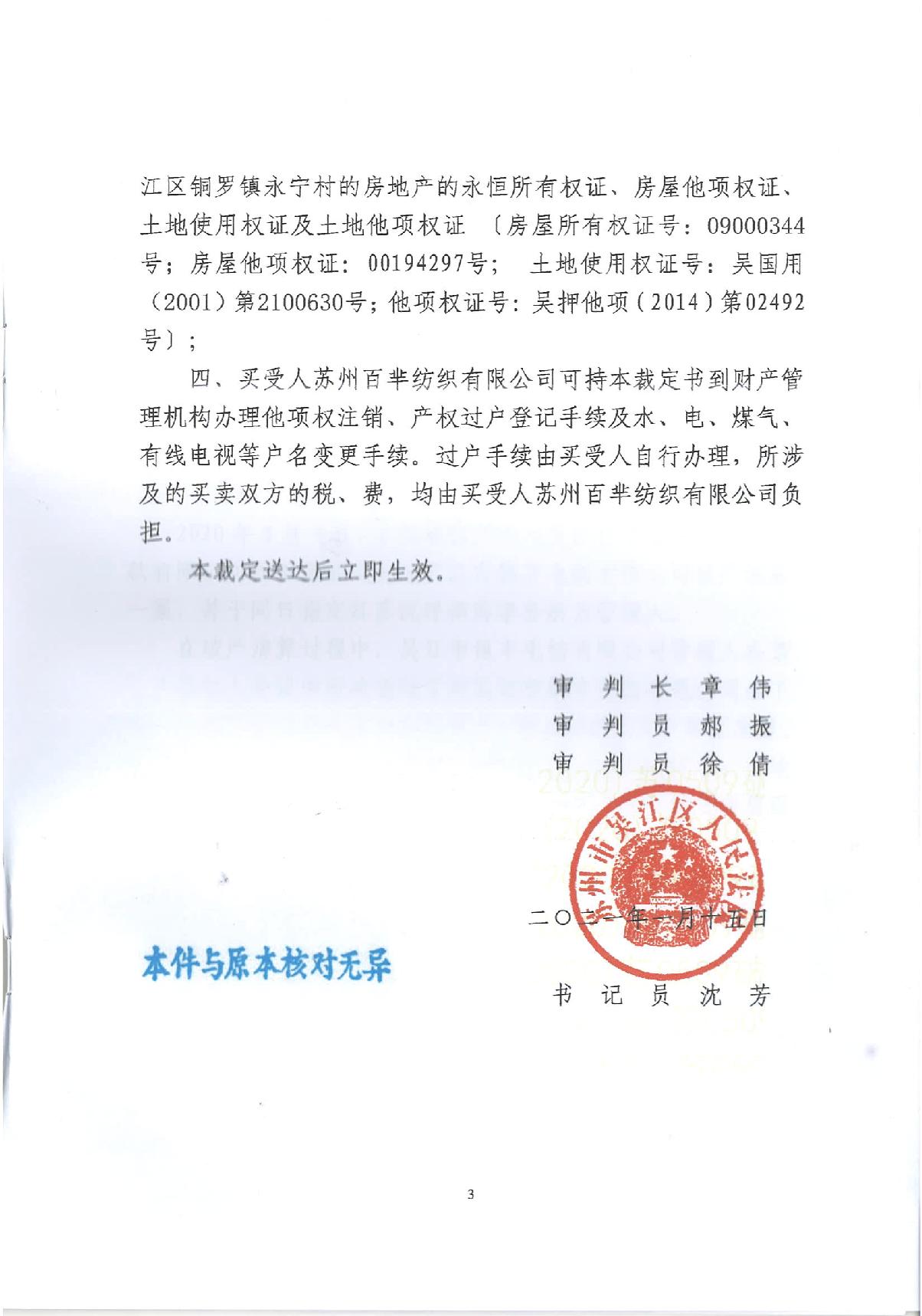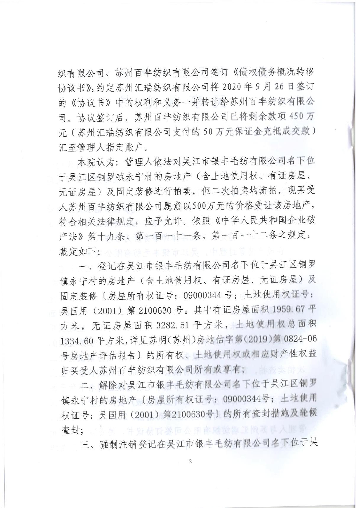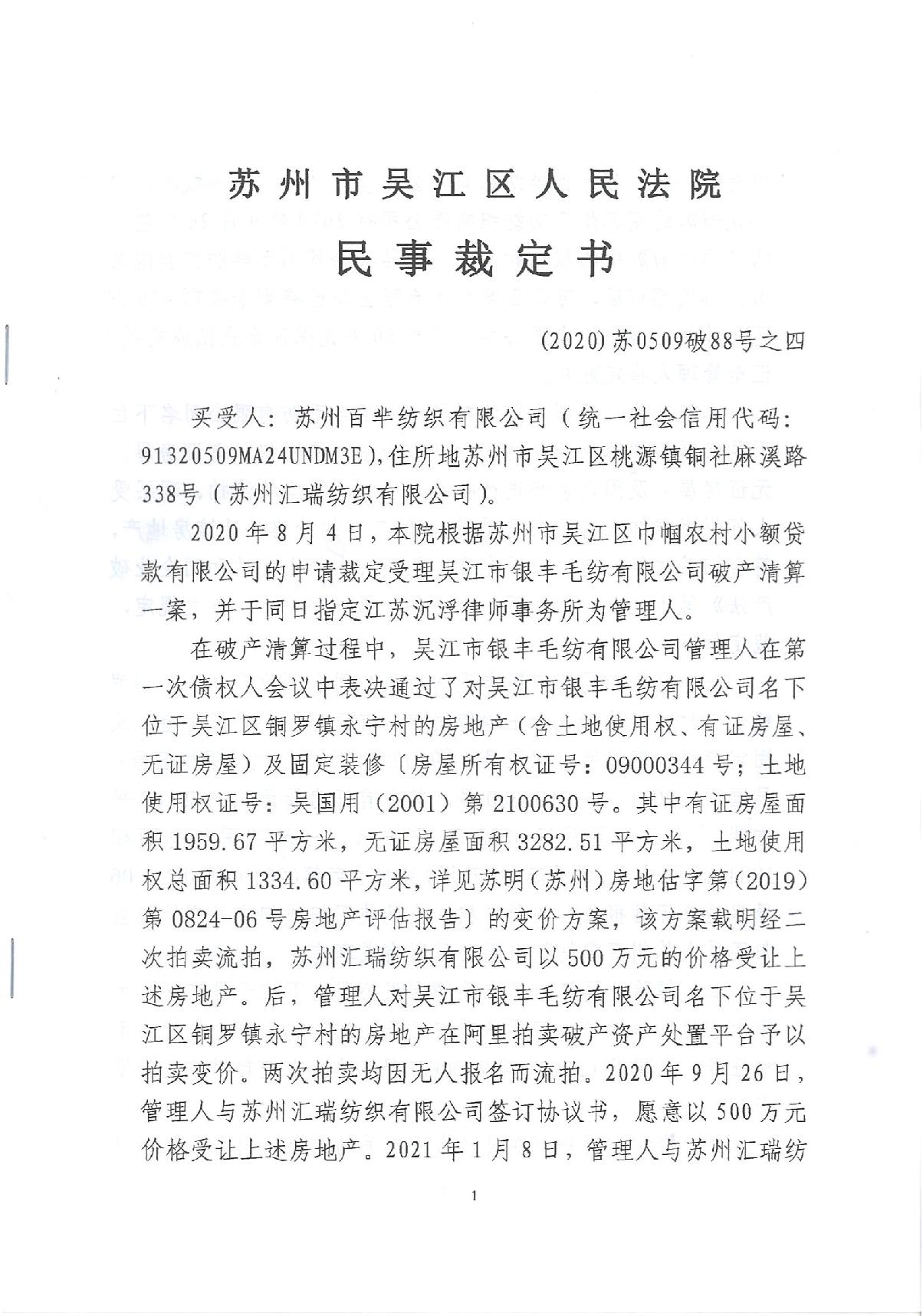 吴江市银丰毛纺有限公司破产清算案资产处置民事裁定书如下图所示: