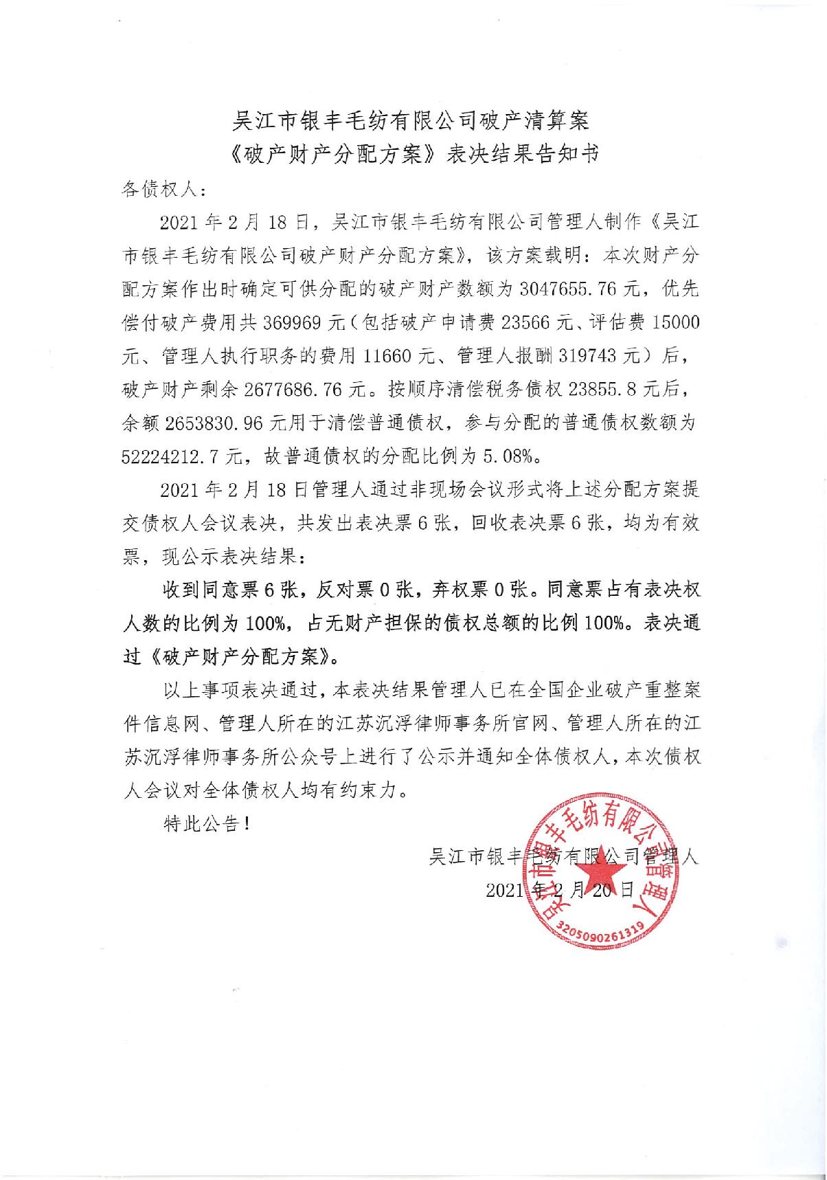 吴江市银丰毛纺有限公司破产清算案《破产财产分配方案》表决结果告知书如下图所示: