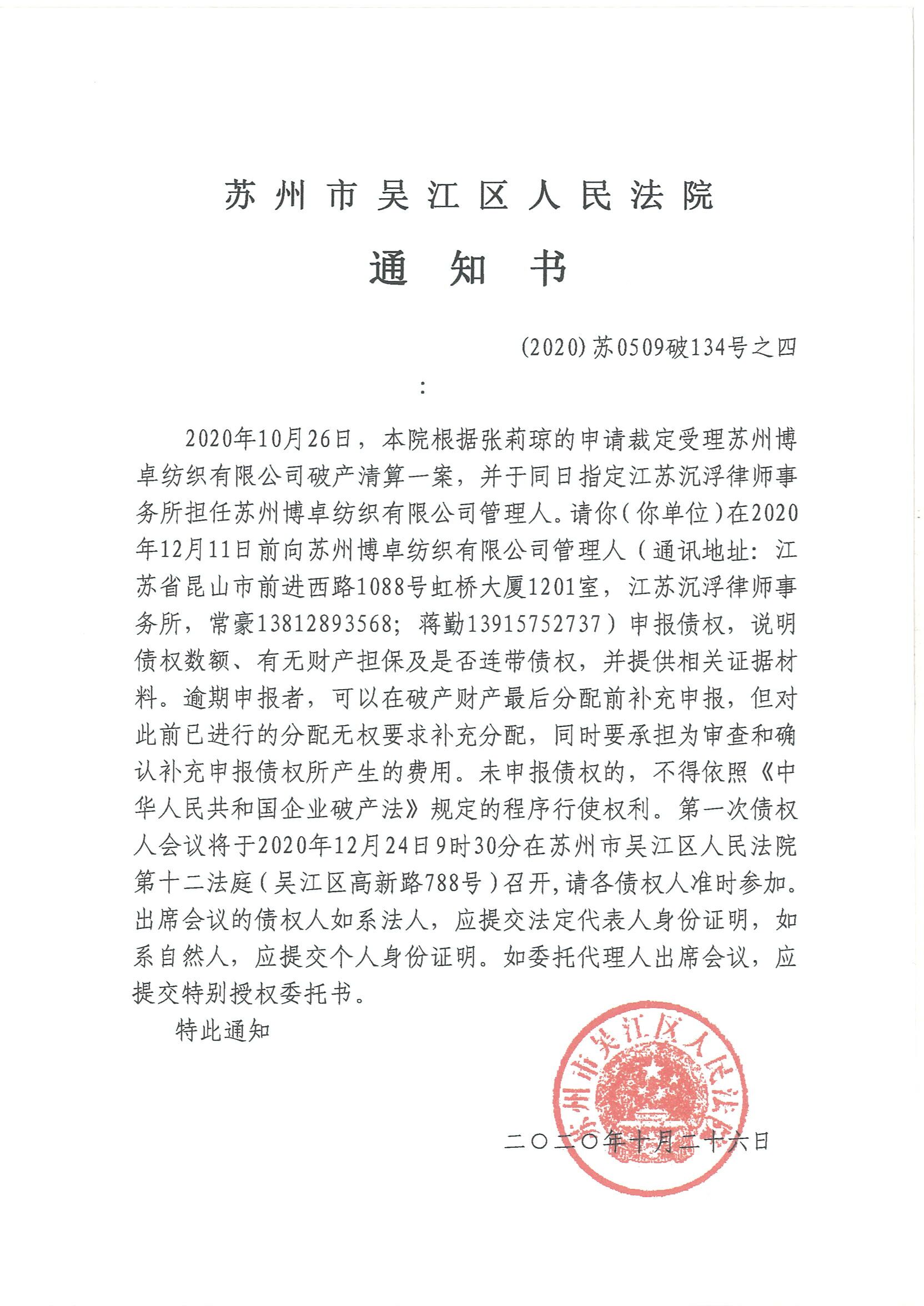 苏州市吴江区人民法院根据张莉琼的申请,于2020年10月26日作出了(2020)苏0509破134号《民事裁定书》,裁定受理了苏州博卓纺织有限公司(以下简称“博卓公司”)破产清算一案,并于2020年10月26日指定江苏沉浮律师事务所为博卓公司管理人。