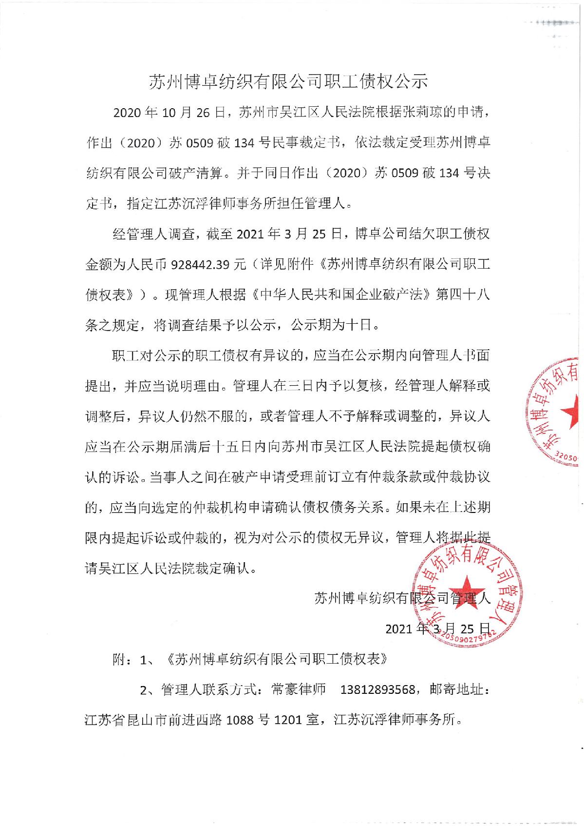 苏州博卓纺织有限公司债权表公示及职工债权表公示
