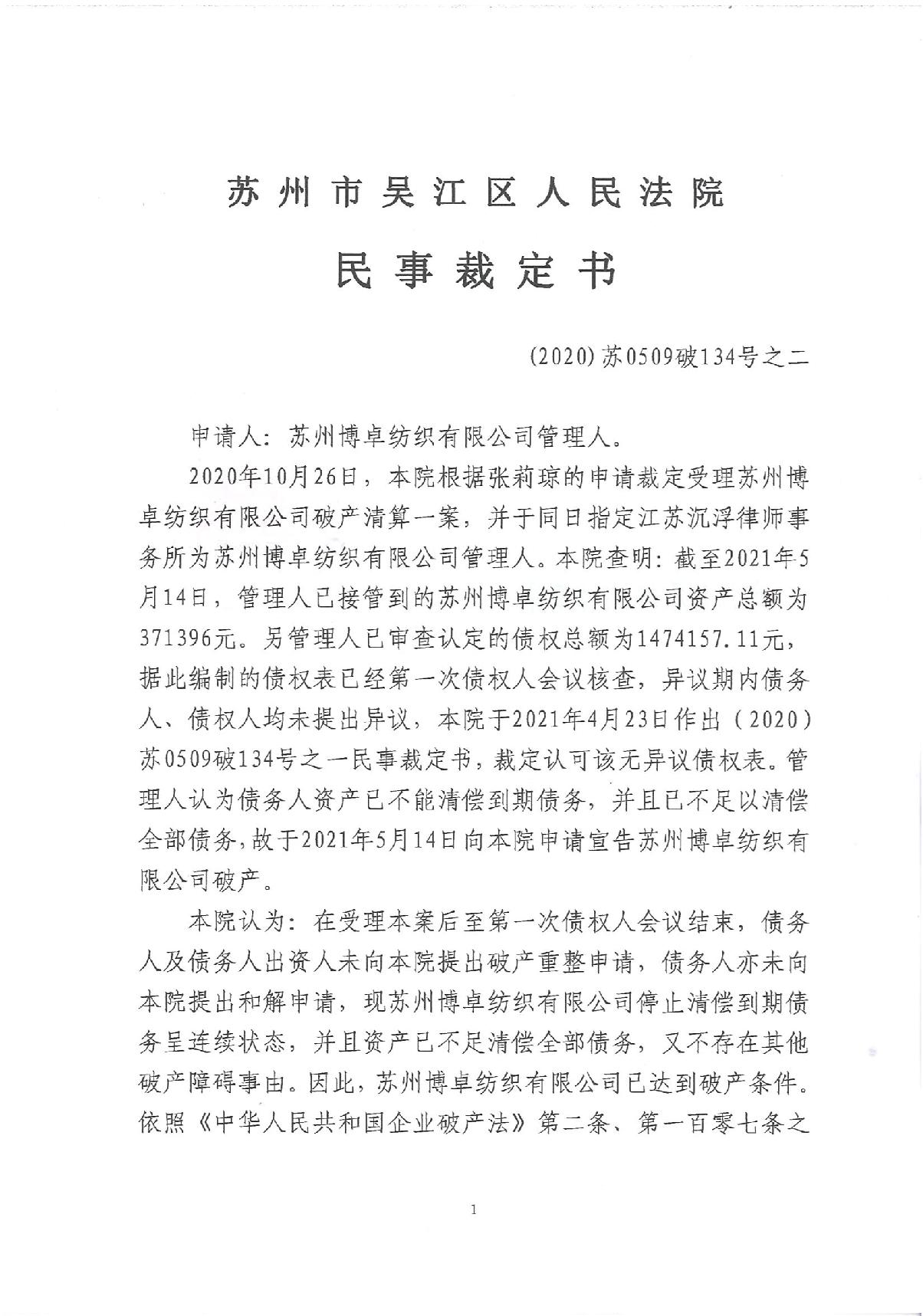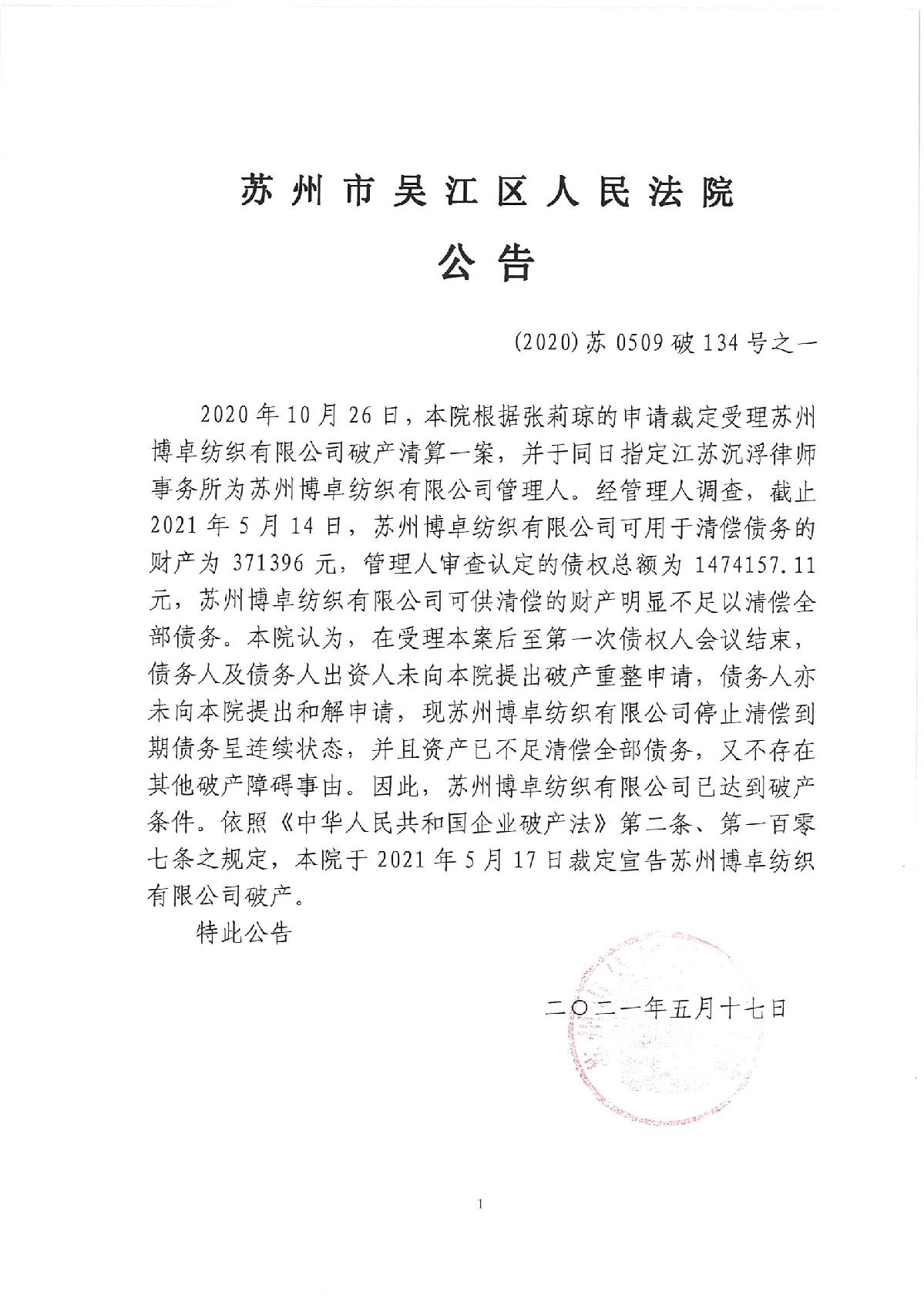 苏州博卓纺织有限公司宣告破产的裁定及公告