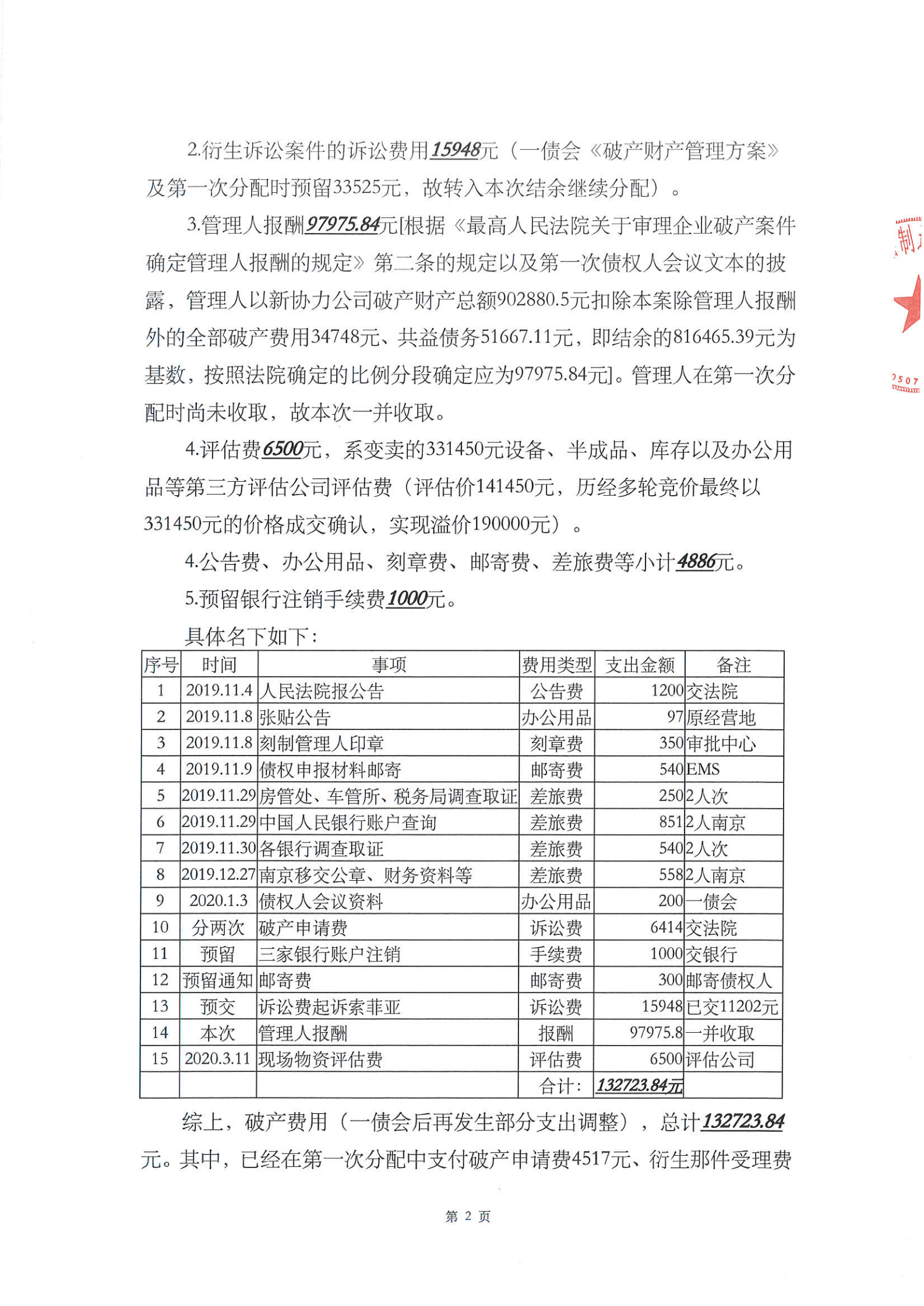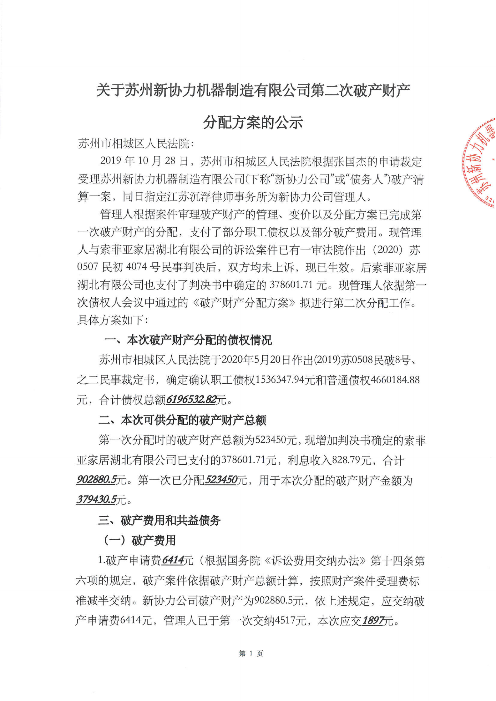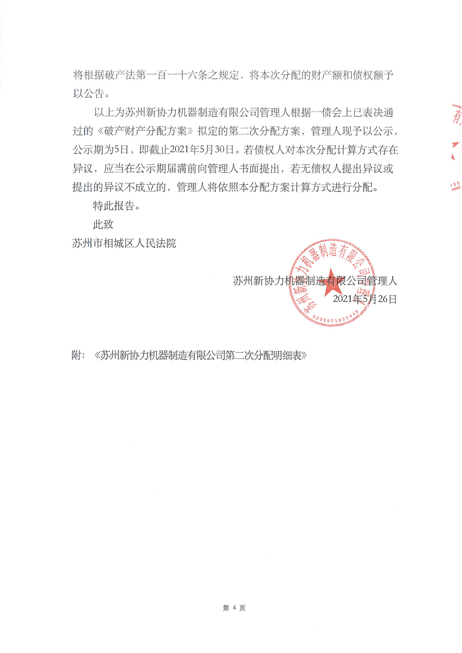 关于苏州新协力机器制造有限公司第二次破产财产分配方案的公示